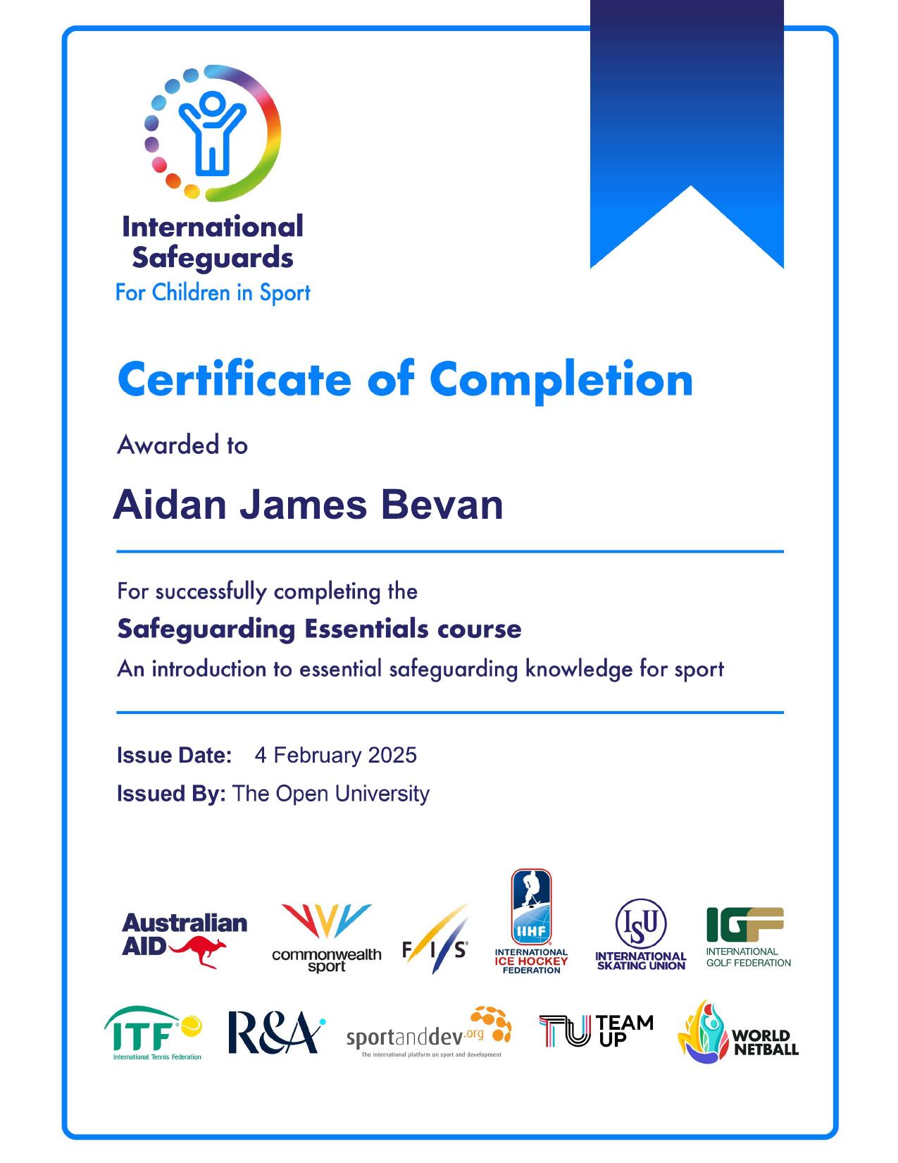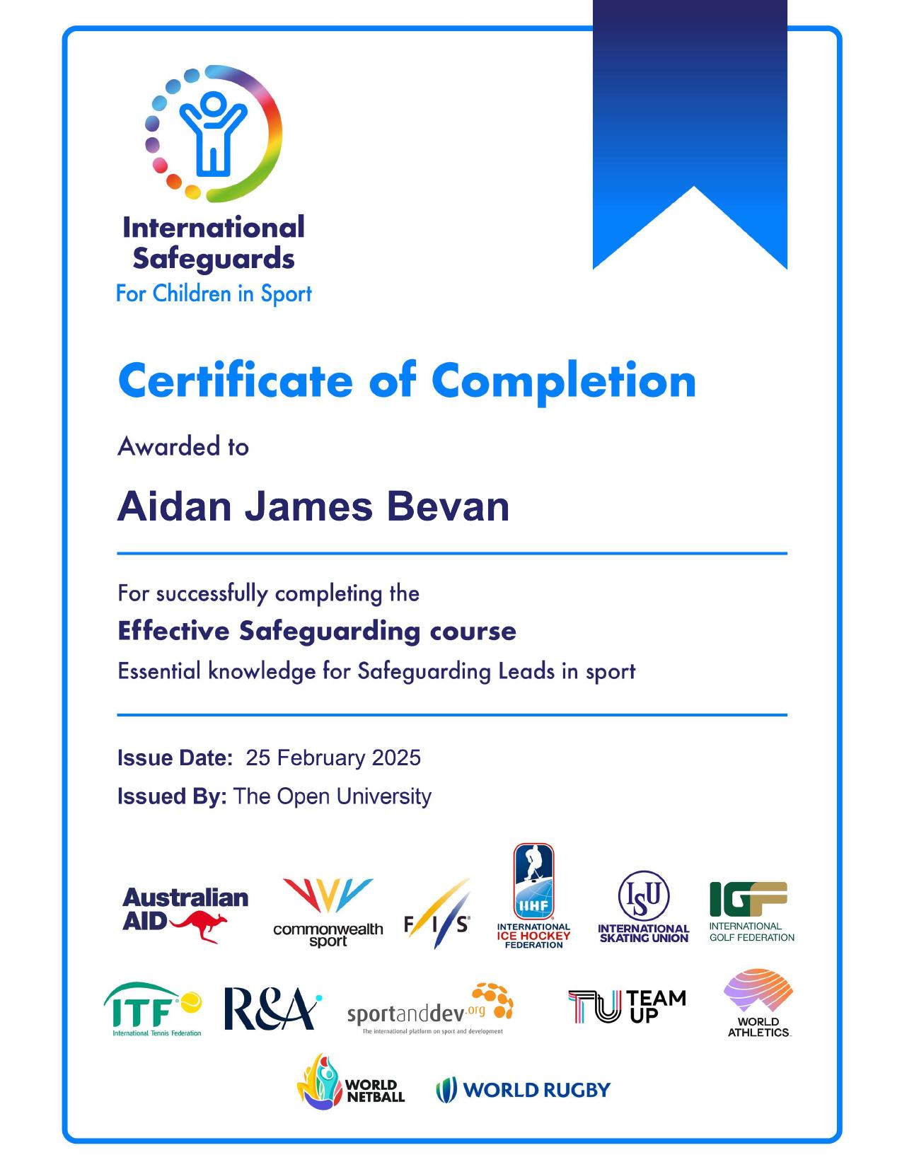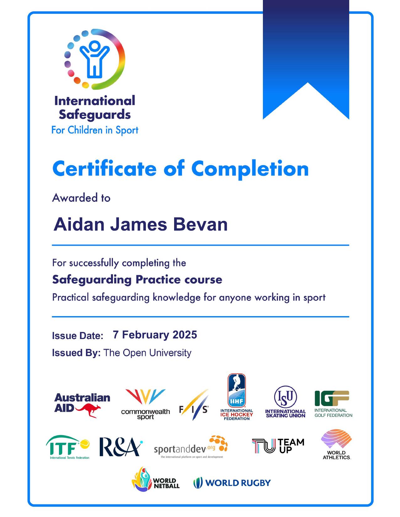 Completed Safeguarding training to ensure the safety and wellbeing of all young athletes, maintaining the highest standards of child protection.